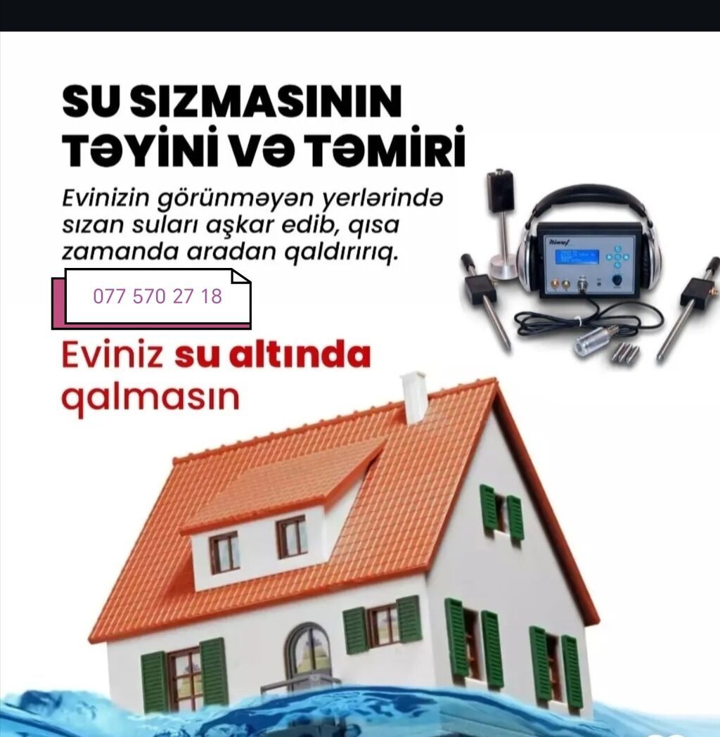 Su sızmasının təyini və təmiri xidmətiMəsafəyə görə qiymətdə dəyişilir. - Gizli sızmaların dəqiq aşkarlanması və qısa zamanda aradan qaldırılması- Yeni nəsil Avropa avadanlıqları: akustik dinləmə və digər ölçü cihazları ilə zərər vermədən yoxlama- Məzillər, fərdi həyət evləri, obyektlər, divarlarda nəmlənmə/kiflənmə, döşəmədə sızma, qonşudan gələn su kimi halların mənbəyinin tapılması və bərpası- Metal, plastik və digər materiallı xətlərdə mənbənin lokallaşdırılması- Daxili məkanlarda və açıq sahələrdə nöqtəvi yoxlama- 15 illik təcrübəyə söykənən peşəkar, etibarlı xidmət- Görülən işə zəmanət- Münasib qiymət, yüksək keyfiyyətEviniz su altında qalmasın.Gizlət