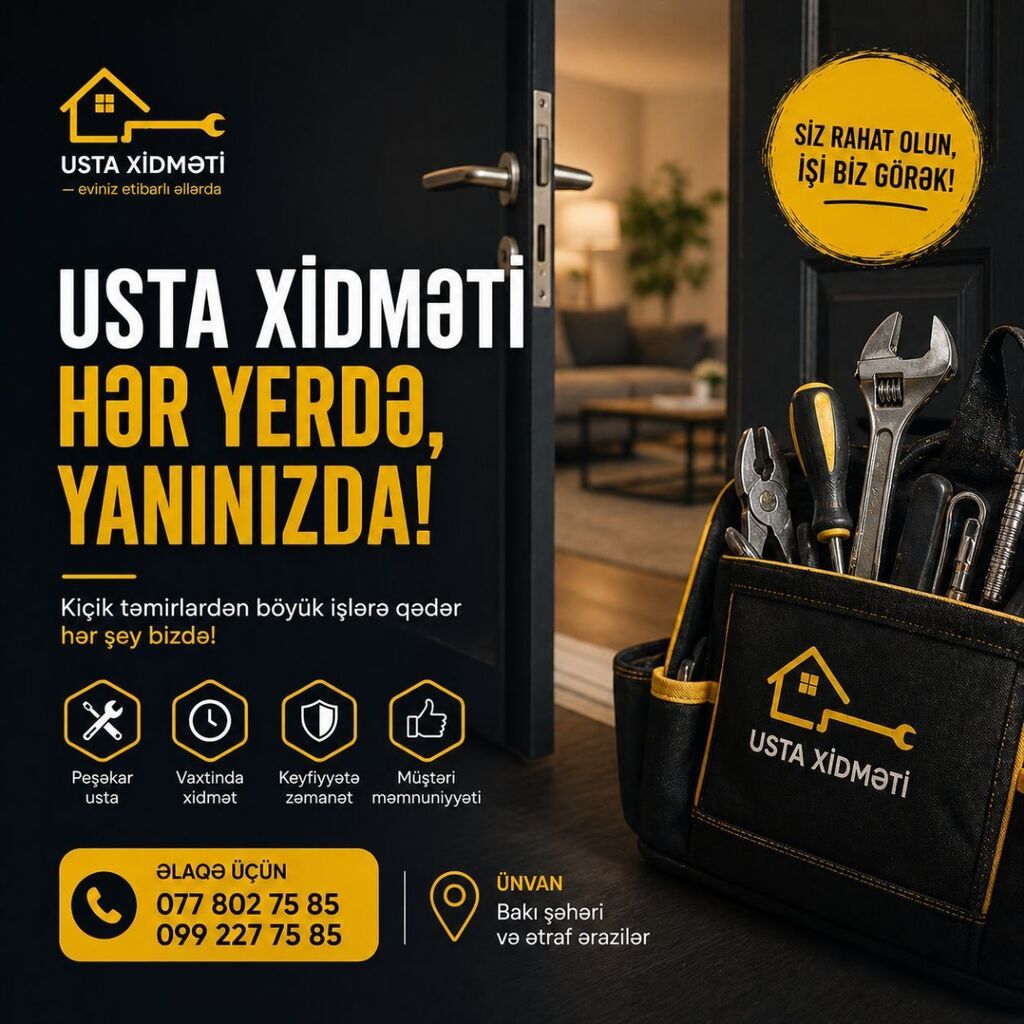 Usta xidməti – hər yerdə, yanınızda!Kiçik təmirlərdən böyük işlərə qədər peşəkar yardım:- Santexnika, elektrik, məişət qurğularının quraşdırılması və təmiri- Qapı, pəncərə, kilid, mexaniki nasazlıqların aradan qaldırılması- Rəngsazlıq, montaj, bərkidilmə işləri- Məişət və interyer üçün xırda ustalıq işləriÜstünlüklər:- Peşəkar usta- Vaxtında xidmət- Keyfiyyətə zəmanət- Müştəri məmnuniyyətiÜnvan: Bakı şəhəri və ətraf ərazilərQeyd: Şəkildə göstərilən əlaqə nömrələri mövcuddur.Gizlət
